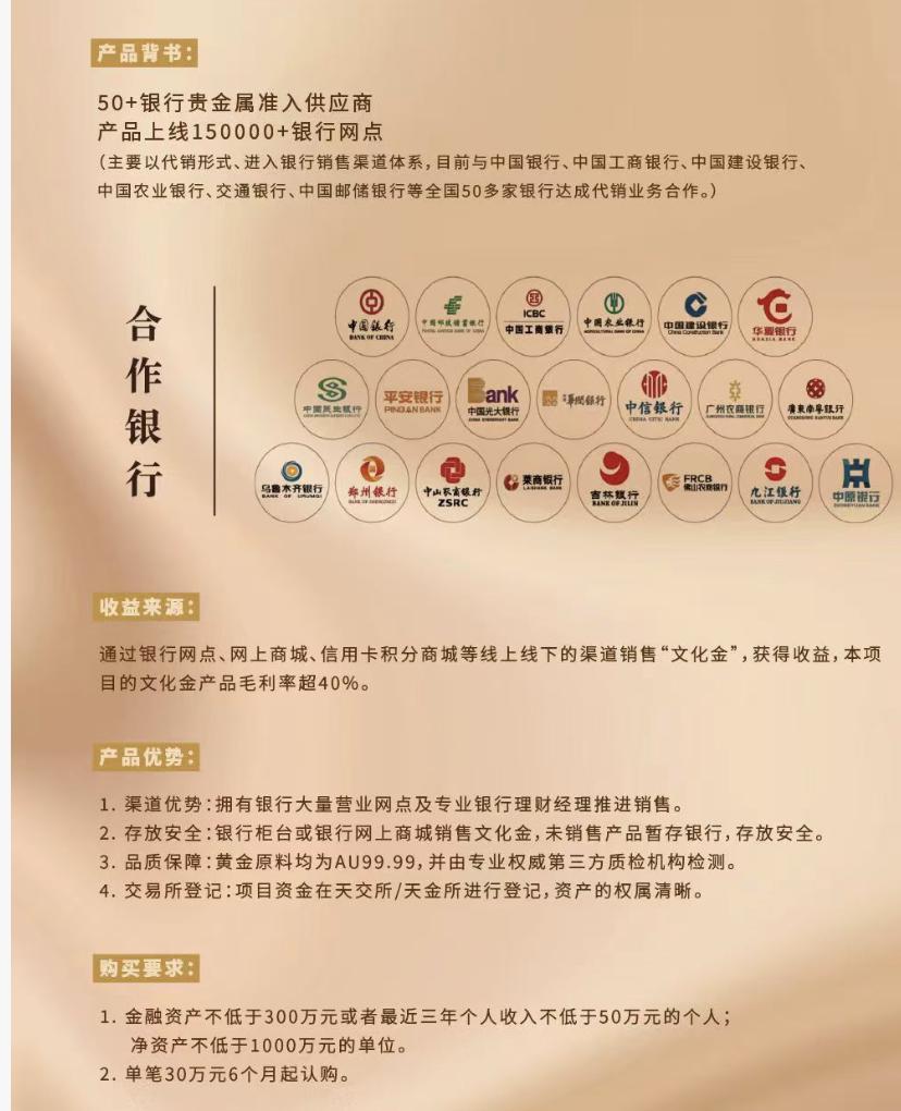 所谓文化金渠道是什么?为什么能提供高额收益?根据投资者提供的一则文化金 " 鑫享世承 " 产品宣传单,该产品自称目前是 50 家银行贵金属准入供货商,产品上线 15 万个银行网点。通过上述银行网点、网上商城、信用卡积分商城等渠道销售 " 文化金 ",可以获得超 40% 的毛利率。