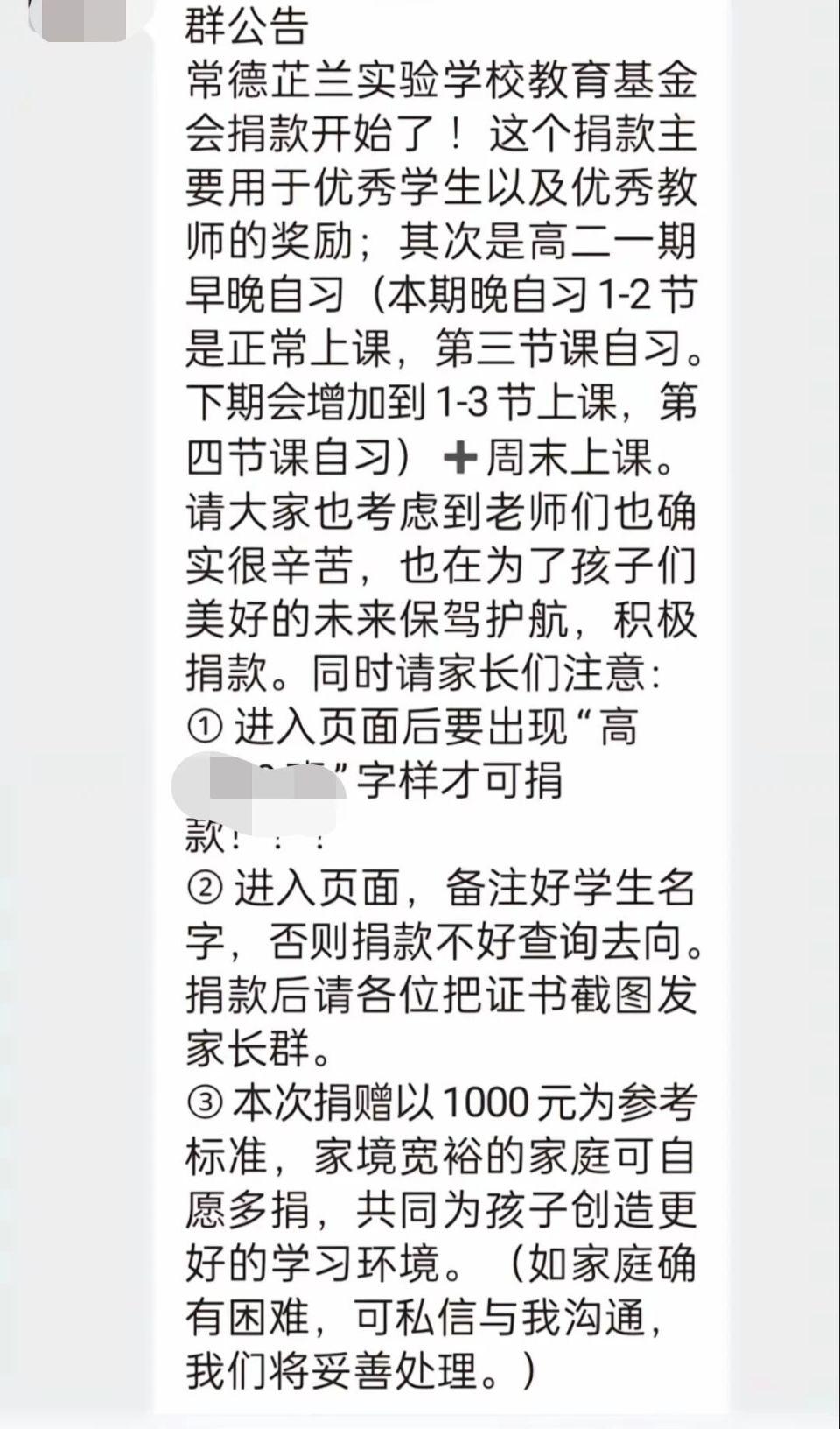 据奔流新闻报道,12 月 22 日,湖南省常德市的网友在社交平台反映,常德芷兰实验学校某家长群内发布公告要求学生向校教育基金会捐款,主要用于优秀学生以及优秀教师的奖励,其次为老师上自习和周末上课的奖励费用。参考标准为 1000 元,家庭宽裕的家庭可自愿多捐。