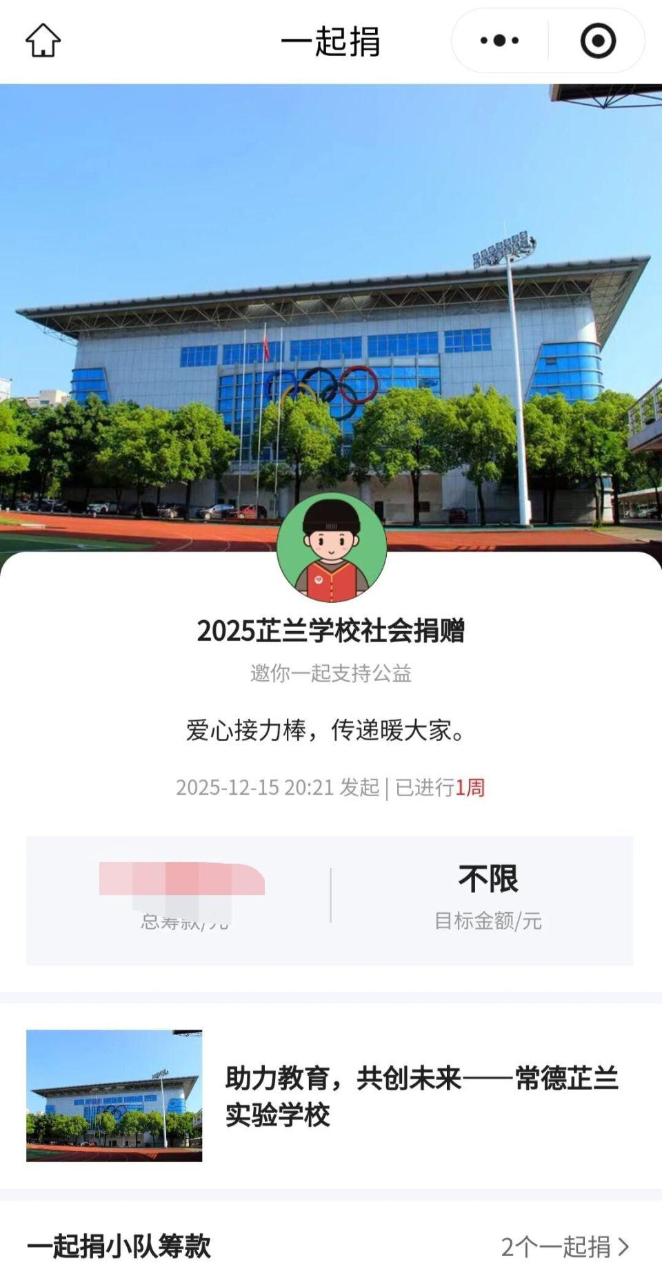 12 月 23 日,奔流新闻记者以家长身份从常德芷兰实验学校了解到,群公告为家委会编撰发布,学校并未强制要求学生捐款,也未设定捐款金额,一切以自愿为主,具体捐款事宜已在学校微信公众号发布。记者登录该校公众号后看到,捐赠秉承自主自愿原则,所有企事业单位、社会团体、各界人士和广大校友、在校师生员工均可捐赠。捐赠财物将严格管理,专款专用,接受监督。捐赠用途为奖励品学兼优的学生及师德高尚、业务精湛的优秀教师和资助家庭经济困难或突发变故的师生。同时,募捐倡议还表示,会对所有捐赠者登记造册,存入校史档案;定期公布善款和物资使用进展;对作出突出贡献的个人、班级、团体进行不同方式的表彰。记者扫描了倡议书提供的二维码,点击 " 常德市教育基金会 " 后,看到目标金额一栏标注为 " 不限 "。在已捐款的明细中,有捐赠 1000 元的,也有捐赠 1 元的。