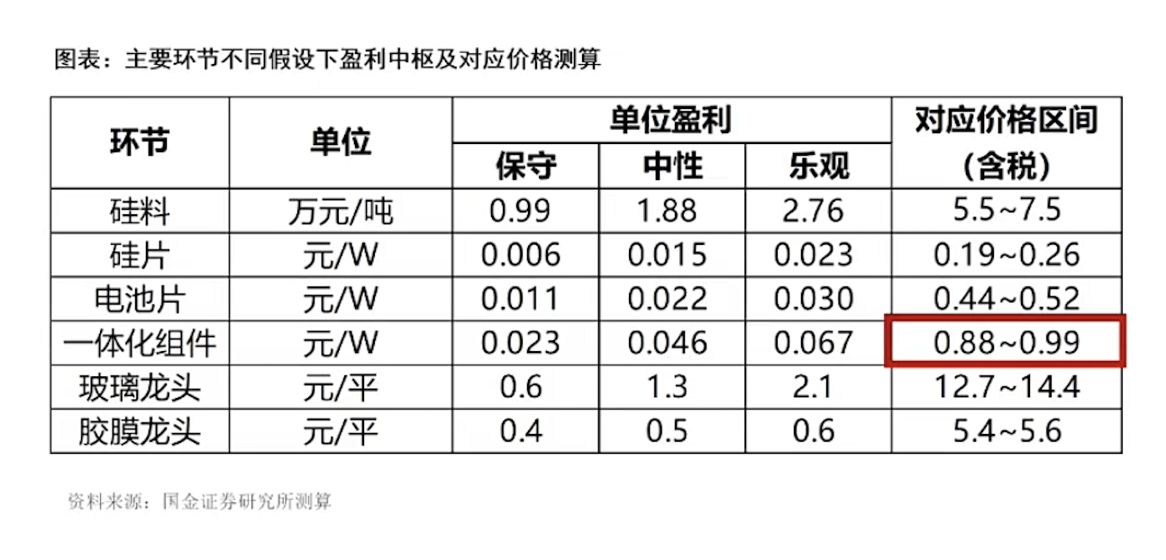姚遥的测算数据显示,基于“反内卷有效推进,各环节产品销售价格覆盖企业全成本”的核心假设,并考虑保守/中性/乐观三种情景下的各主要产业链环节的盈利复水平,2026年硅料价格区间在5.5-7.5万元/吨,一体化组件价格区间在0.88-0.99元/W。