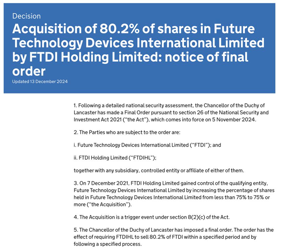 然而在交易完成近三年后,2024 年 11 月 5 日,英国政府突然依据《2021 年国家安全与投资法》(NISA)中的 " 回溯审查 " 条款,对这项收购发起追溯审查,并发布最终命令通知,要求 FTDI Holding Ltd 在限定时间内出售其持有的 FTDI 全部 80.2% 的股权,理由是存在国家安全风险。