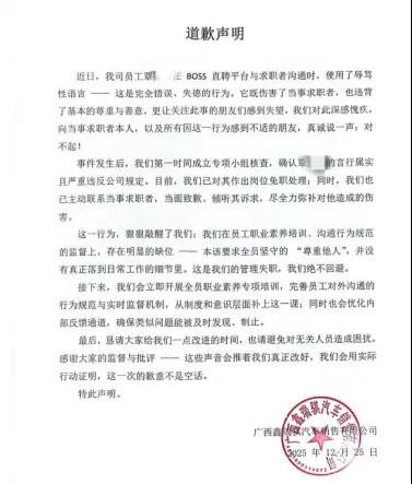同时,该网友还贴出一份盖有广西鑫瑞祺汽车销售有限公司公章的道歉声明。声明称,事件发生后公司第一时间成立专项小组核查,确认覃女士言行属实且严重违反公司规定,已对其作出免职处理,并主动联系求职者当面致歉,尽全力弥补对其造成的伤害。接下来公司将开展员工职业素养培训,确保类似问题能及时发现、制止。