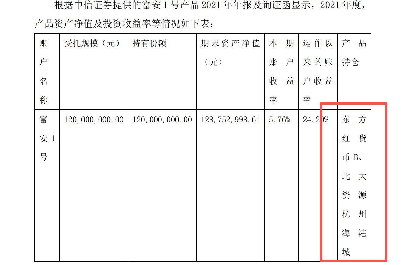 一方面,中信证券提供的富安1号2021年报及询证函显示,富安1号2021年度当期账户约定年化收益率5.76%,产品持仓为东方红货币B、北大资源杭州海港城两个标的。但后续经富安娜调查发现,富安1号投资款非直接投向前述两个标的,而是通过一信托计划进行,且底层涉及一烂尾地产项目。
