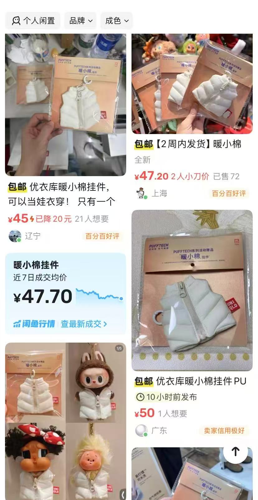 近期,优衣库为推广PUFFTECH空气棉服系列,推出了限量赠品“暖小棉”挂件,其可DIY为背包挂饰、适配Labubu等潮玩,热度持续刷屏社交平台,二手平台还被炒至几十元出售,成为年末服饰营销领域的“流量黑马”。