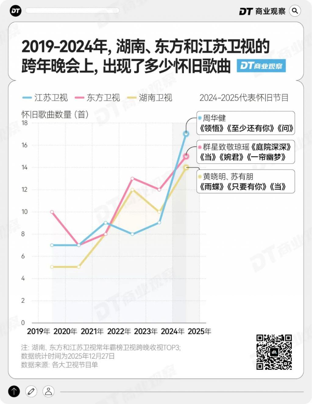 《DT 商业观察》统计了湖南卫视、东方卫视和江苏卫视(这三个卫视的收视率常年霸榜卫视跨晚 TOP3)2019 年 -2024 年的跨晚节目单,数据显示," 怀旧歌曲 " 的数量在最近 5 年飞速增长,并在去年达到了顶峰。