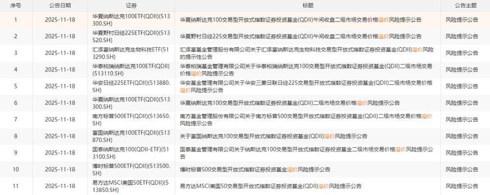 而 11 月开始,A 股面临回调压力,境外 ETF 再受青睐,一个月内机构关于高溢价风险提示的公告就达上百条。