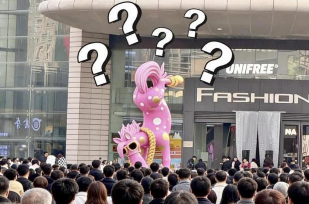 雕塑刚一展出,就引来不少市民驻足打卡,拍照分享,气氛挺热闹。然而,好事没持续多久就变了味。有网友看到这匹马头朝下,就戏言是 " 头逆 ",再联系到马,就是头逆马。在太原方言里," 头逆马 " 是个带点粗俗意味的骂人话。网友这么一说,这个谐音梗立马火了起来。有人专程跑去商场围观,不断有网友跑去打卡 " 头逆马 "。原本寓意吉祥的雕塑,一夜之间被贴上尴尬标签,陷入 " 社会性死亡 "。