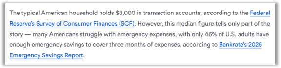 他们的储蓄账户中位数仅有 8000 美元,只有 46% 的美国成年人拥有足够支付三个月开支的应急储蓄。