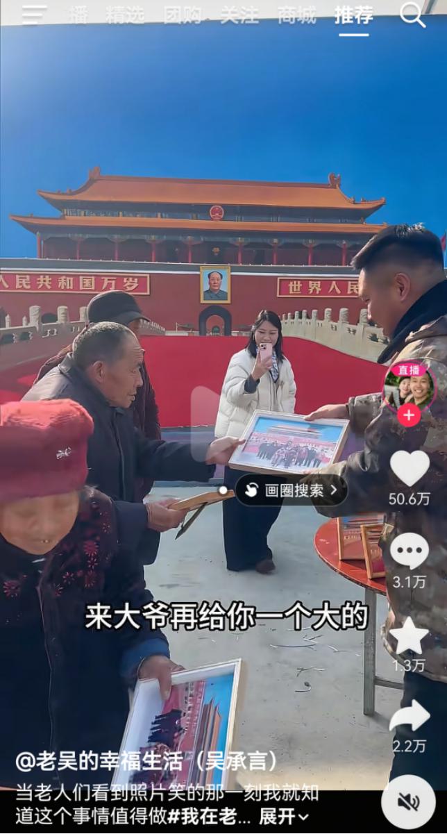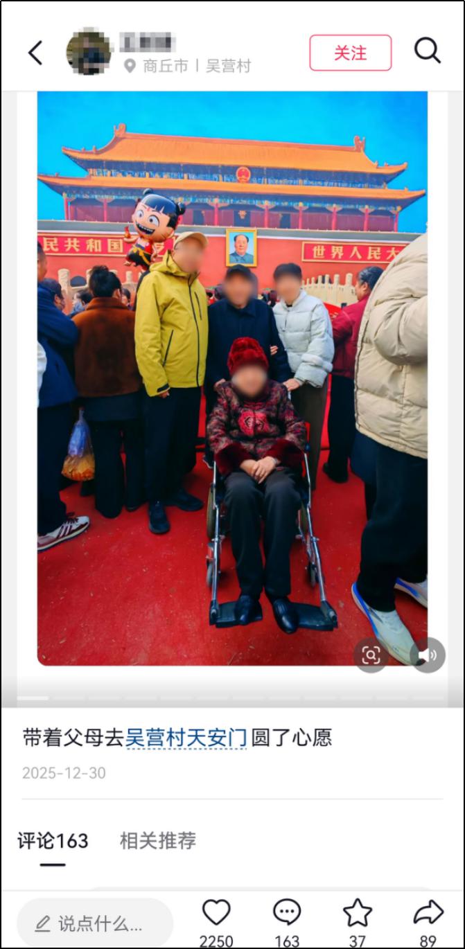 也是去年 12 月,他和村里老人聊天,得知他们想去看看天安门,但现在年纪大、行动不便,所以可能一辈子都没能如愿了。