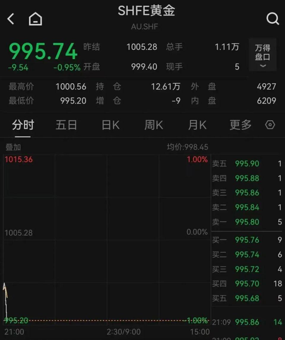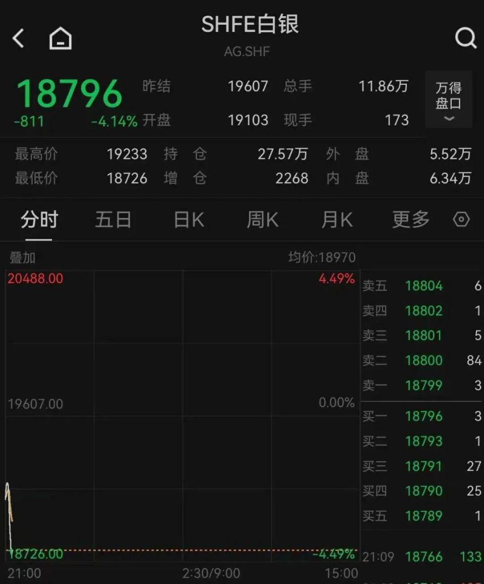 沪金、沪银期货主力合约同样下跌。截至发稿,沪金期货主力合约跌 0.95%,报 995.74 元 / 克;沪银期货主力合约跌超 4%,报 18796 元 / 千克。