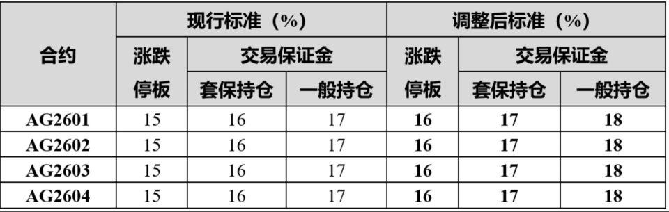 上期所发布通知称,经研究决定,自 2026 年 1 月 9 日(星期五)收盘结算时起,交易保证金比例和涨跌停板幅度调整如下: 白银期货 AG2601、AG2602、AG2603、AG2604 合约的涨跌停板幅度调整为 16%,套保持仓交易保证金比例调整为 17%,一般持仓交易保证金比例调整为 18%。