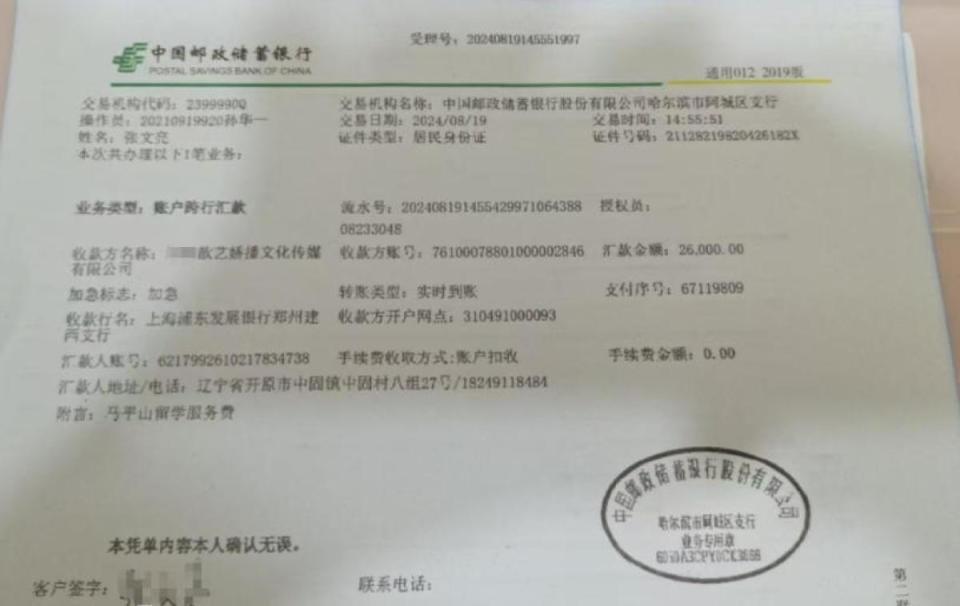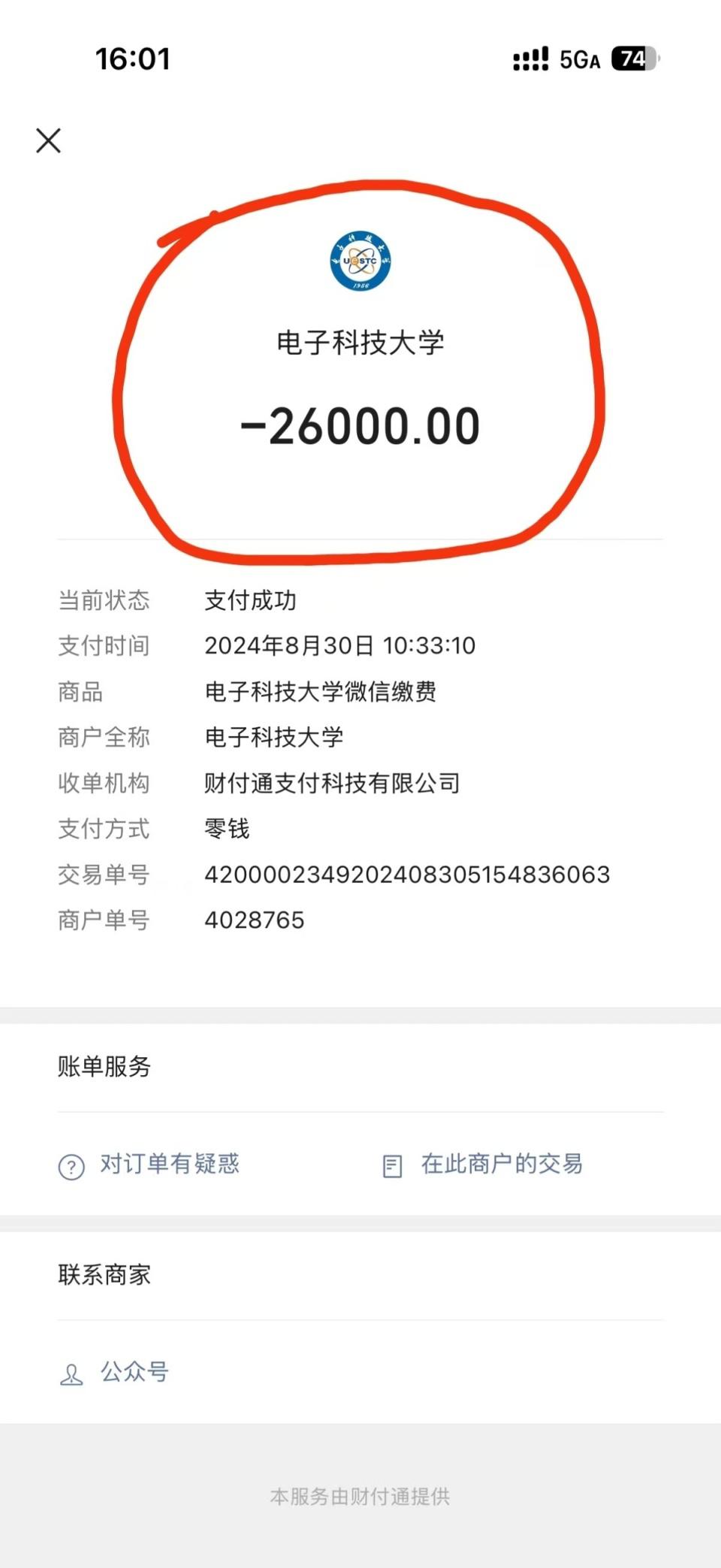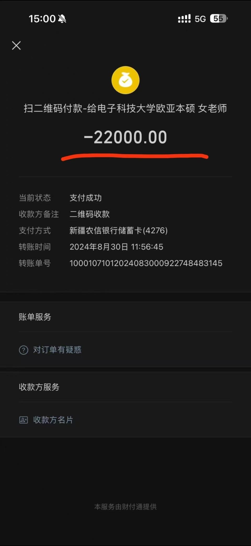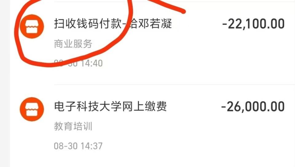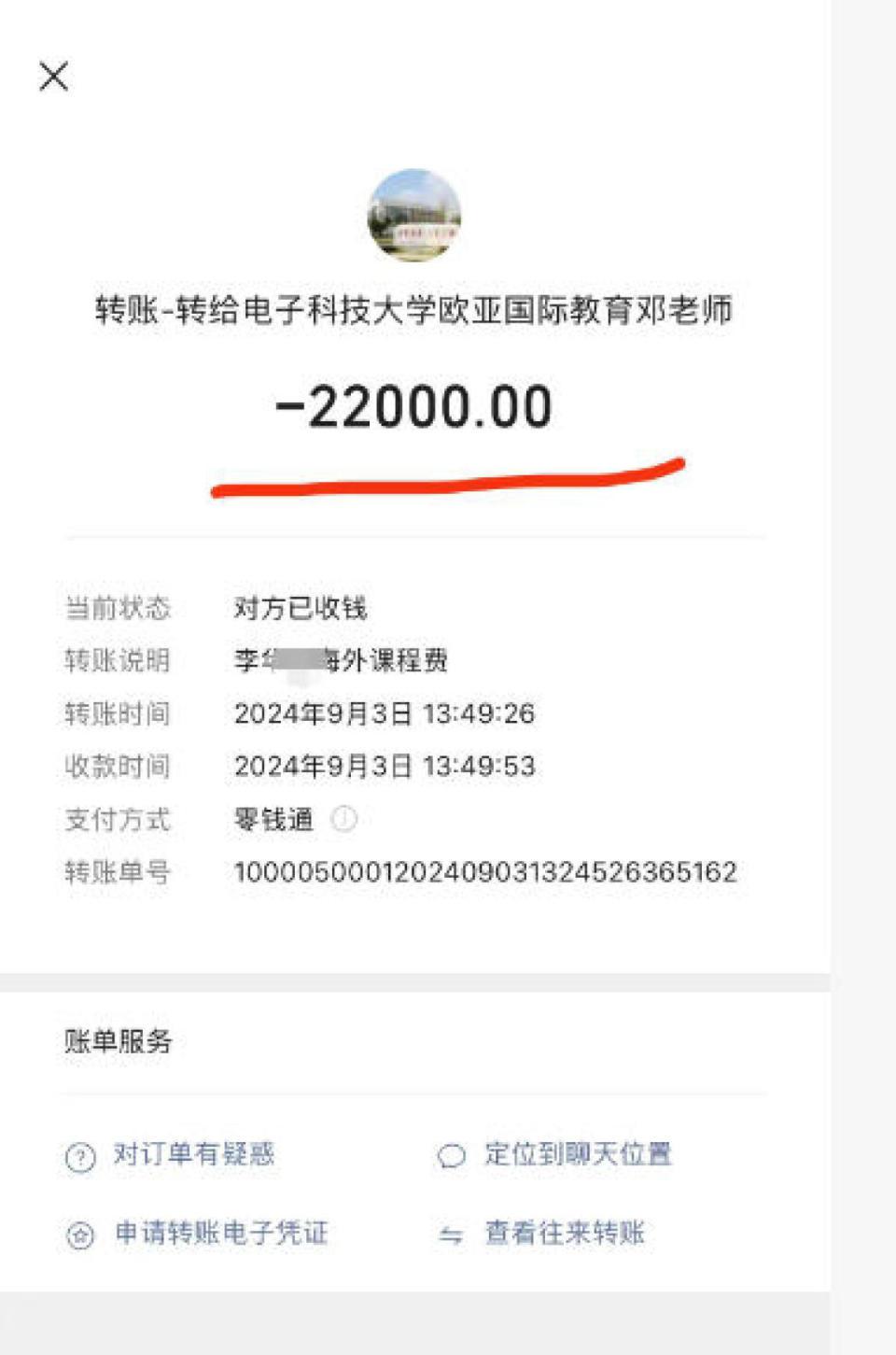 2025 年 12 月 30 日,记者在采访中发现,选择 1+1 学制的学生第一年缴纳了两笔费用:一笔 26000 元转入电子科技大学,另一笔 22000 元以 " 海外课程体系费用 " 名目转给了一位名叫邓若凝的女士。其中,小钱缴纳了 56000 元的 " 海外课程体系费用 "。