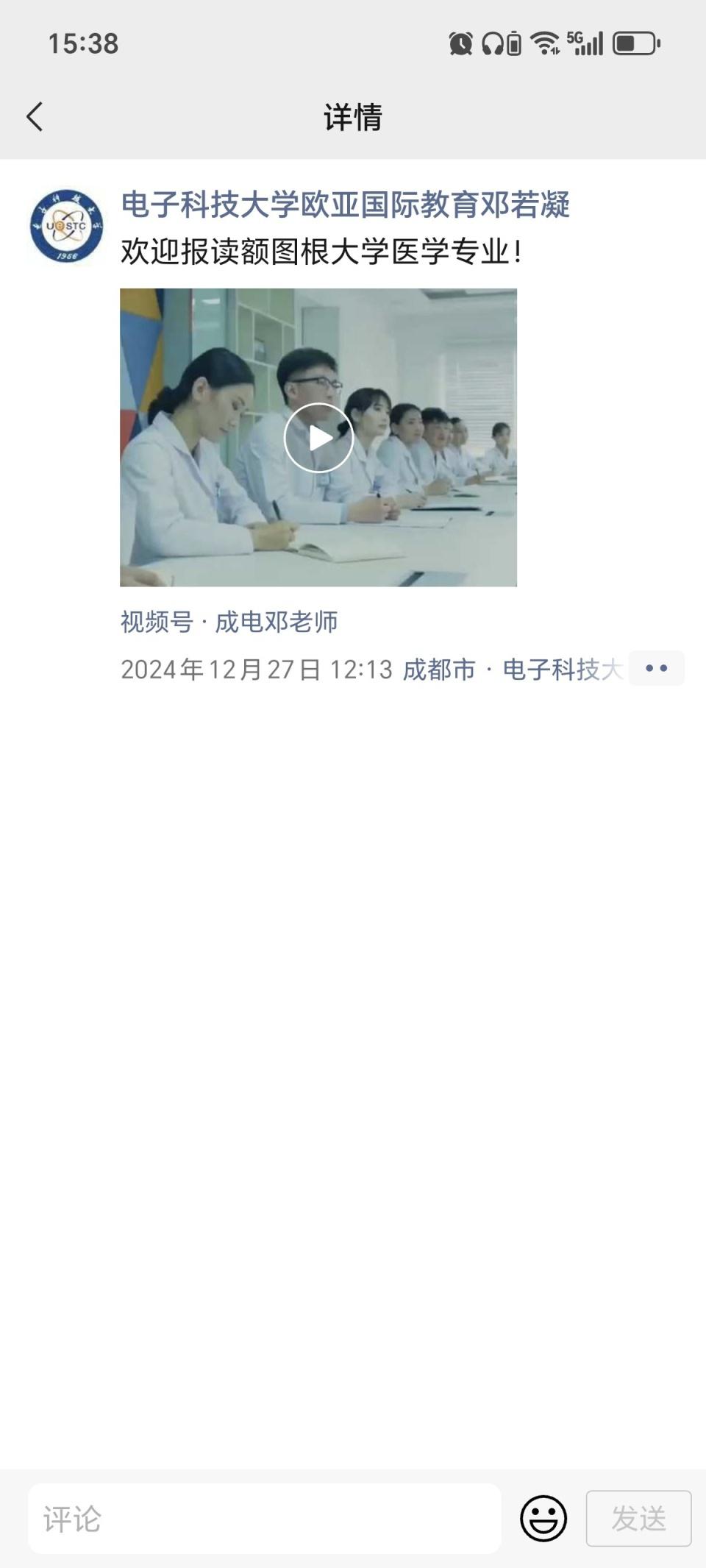 2025 年 12 月 30 日上午,记者通过电话联系到了邓若凝女士,在电话中,邓女士告诉记者,自己是电子科技大学的工作人员,负责学校的欧亚教育项目," 我们不是合作办学,是属于额图根大学委托电子科技大学医学院的联合委托培养,两校之间有学分互认协议,娄超应是额图根大学委托招生的人员,并负责给学生做留学服务和办理留学手续的,学生第一年在电子科技大学上的学分单会给额图根大学进行开具,是算学分的,另外,我们从未作出过‘两年即可毕业’的承诺。"