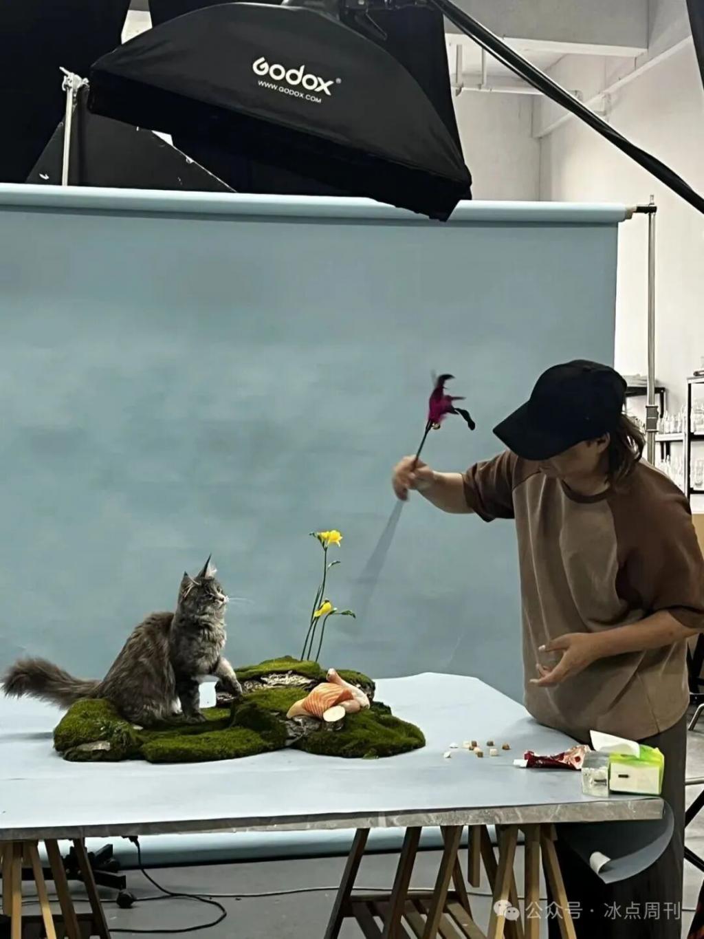 胡艺平在片场用逗猫棒引导小猫抬头向上看,模仿出渴望食物的姿态。