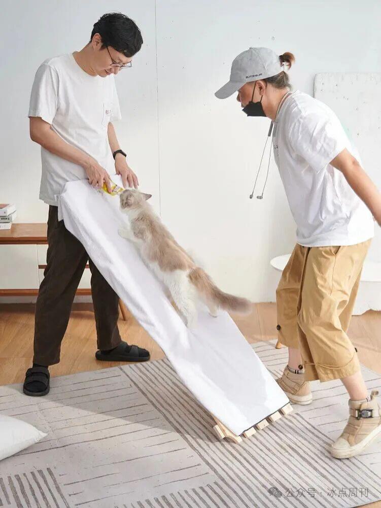 某品牌猫粮广告拍摄时,胡艺平(右)和同事引导小猫做出向上攀登的动作。