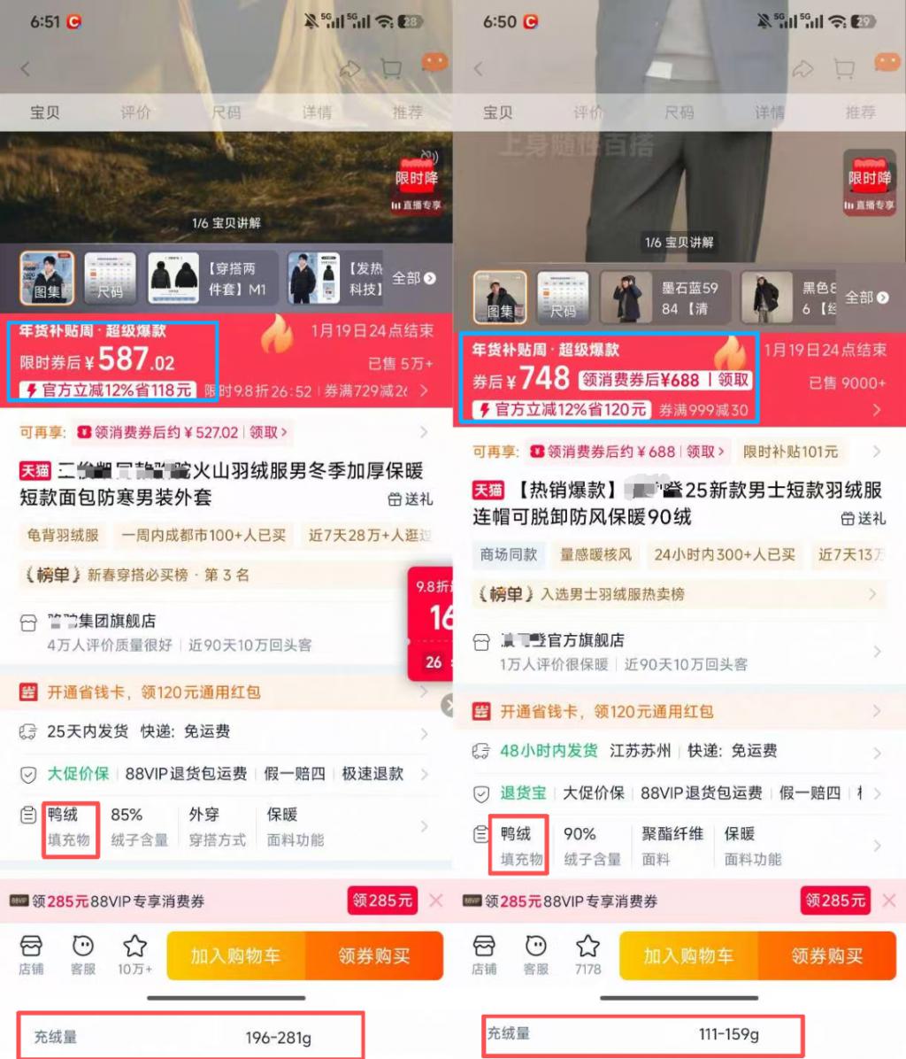 例如,山姆 499 元的羽绒服充绒量高达 400 克,Costco 的 359 元款也有 180 克充绒量。而对比高端羽绒服,在电商平台找到两家大牌羽绒服发现,充绒量分别在 111~159 克、196~281 克间的羽绒服,售价却分别为 748 元、587 元,这意味着,在拥有更低充绒量的同时,其羽绒服的售价反而更高。