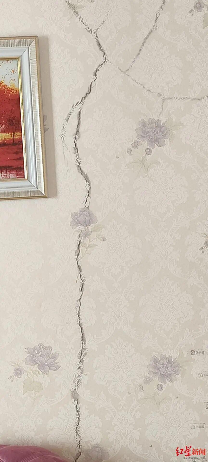 多位业主向记者提供了家中房屋的裂缝照片,墙面上出现的裂纹有的从屋顶的天花板延伸向下,有的从中间出现,裂缝多的业主家一面墙甚至出现四五条长短不一的裂缝。