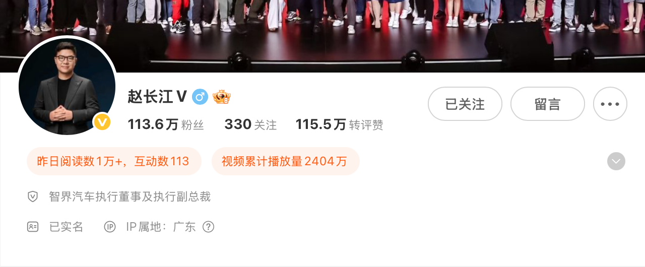 赵长江彼时的微博IP地址也显示为安徽,而智界是由奇瑞与华为合作打造的品牌,奇瑞总部位于安徽芜湖。评论区有网友指出其“加入智界”,但赵长江并未回应。
