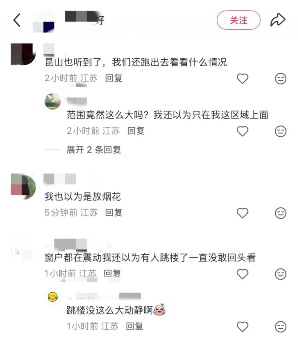 苏州吴中区居民李女士则表示,自己午睡时被巨响惊醒," 像‘炸雷’一样,我赶紧起身到客厅,发现家具轻微抖动,天花板的吊灯也晃了两下。"