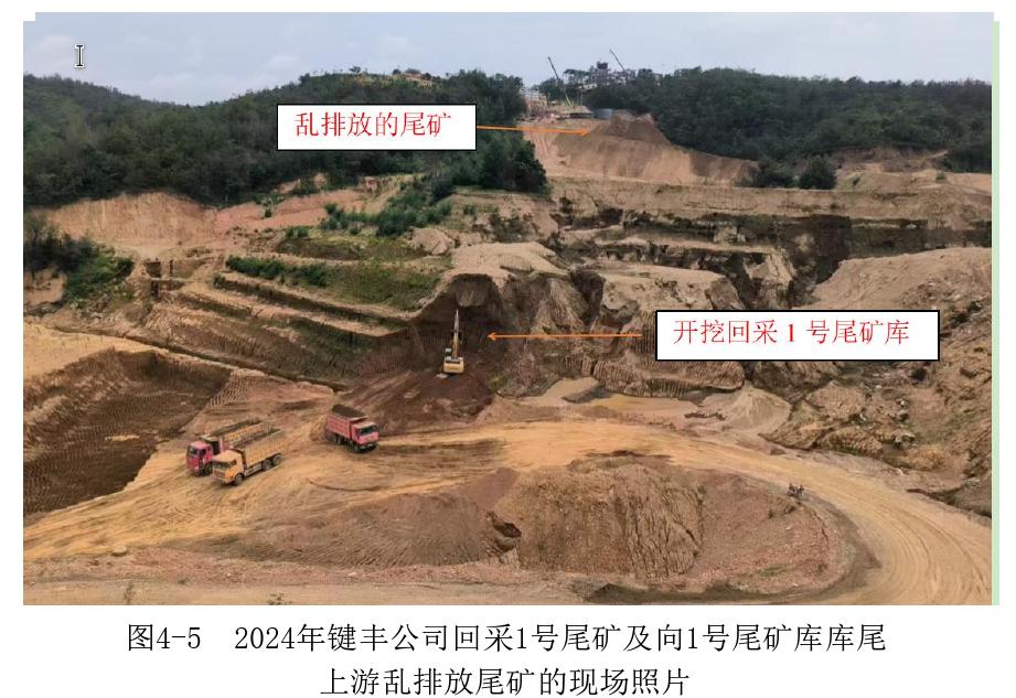 2025 年 5 月 5 日 8 时许,键丰公司组织 5 辆货车先后到尾矿堆场下方倒运前期回采尾矿时挖取的石料。8 时 38 分,1 号尾矿库回采开挖形成约 57.5 米的高陡边坡失稳,上部超高堆积的高含水率流塑态软土坍塌,大量坍塌体随沟谷向下游冲击滑移至约 2000 米处形成堆积,造成尾矿堆场下脚的 5 辆货车、1 台挖掘机和 4 名驾驶员及下游沟底约 1200 米处田地间劳作的 1 名村民被坍塌体掩埋。1 名货车驾驶员发现坍塌及时撤离逃生,挖掘机驾驶员未在现场,幸免于难。