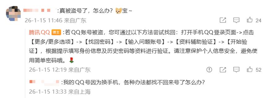 有网友在辟谣声明下留言," 真被盗号了,怎么办 ? 宝 ~",腾讯 QQ 对此回复," 若 QQ 账号被盗,您可通过以下方法尝试找回:打开手机 QQ 登录页面 -> 点击【更多 / 更多选项】->【找回密码】->【输入问题账号】->【资料辅助验证】->【开始验证】,根据提示填写身份信息及历史密码等资料进行验证。请注意保护个人信息安全,避免使用简单密码哦。"