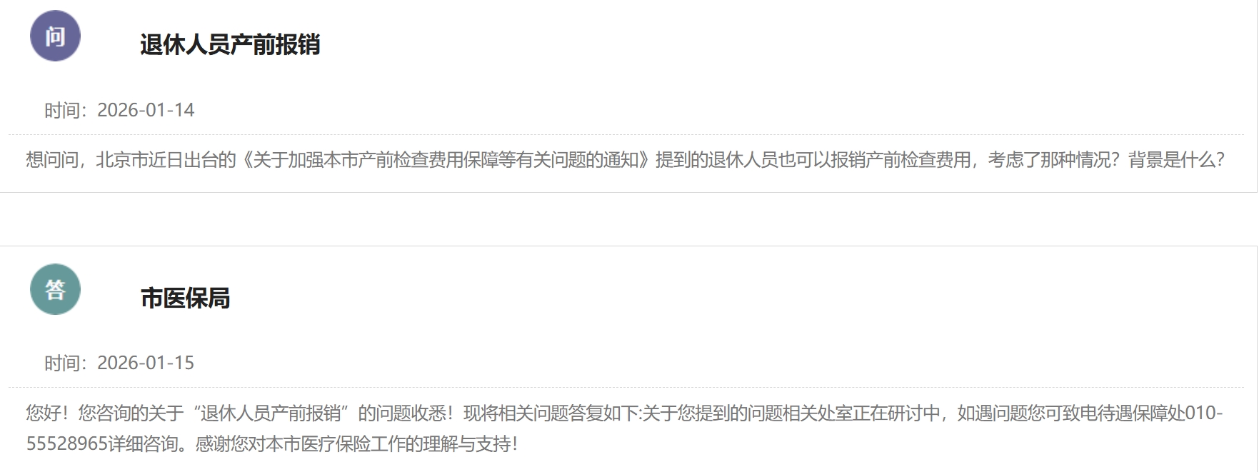 从政策设计初衷出发,“退休人员可享受产前检查报销” 具体考虑了哪些情况?北京医保局网站政务留言板1月15日回复界面新闻称,相关处室正在研讨中,可详细咨询市医保局待遇保障处。随后,界面新闻致电该处,截止发稿尚未接通。