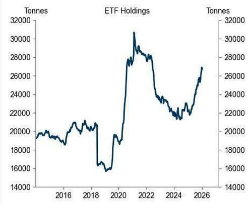 这一趋势仍有增长空间。目前美国非现金金融投资组合中,黄金 ETF 仅占 0.17% ——低于 2012 年的峰值。