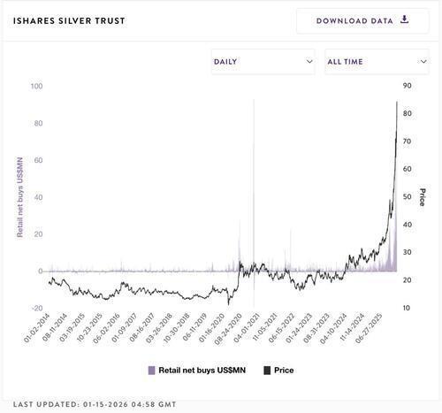 169 天连续涌入纪录:全球最大白银 ETF —— iShares Silver Trust ( SLV ) 正经历史无前例的 169 天连续零售资金净流入。散户已不再只是 " 逢低买入 ",而是进行根本性的资产配置调整。