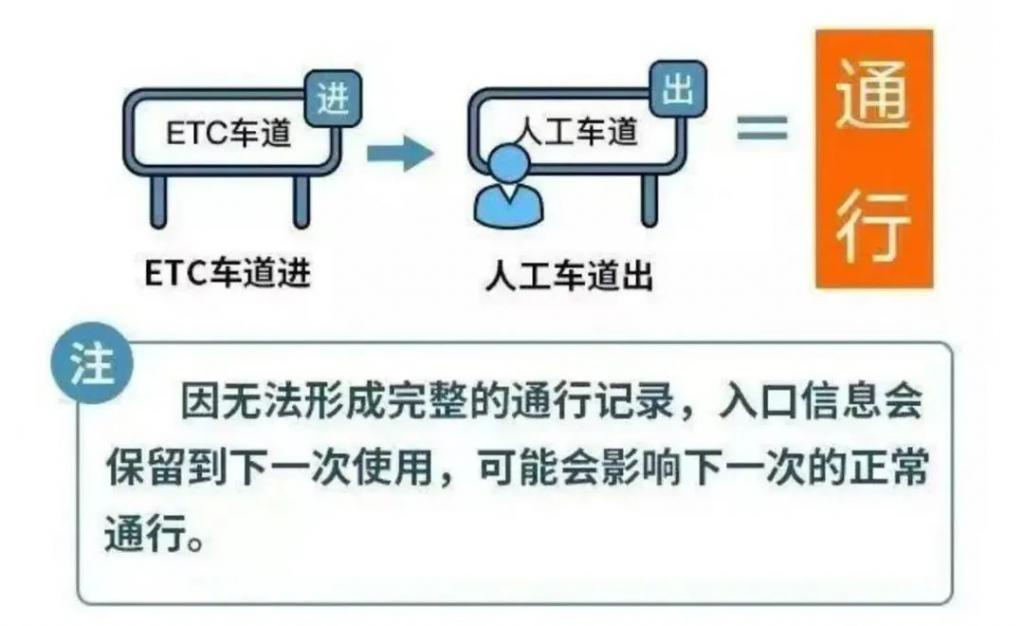 特别是在人工通道上的高速,下高速时不要选择 ETC 通道,否则将无法正常通行,因没有入口信息,出口栏杆机不会抬杆,只能折返至人工车道驶出。