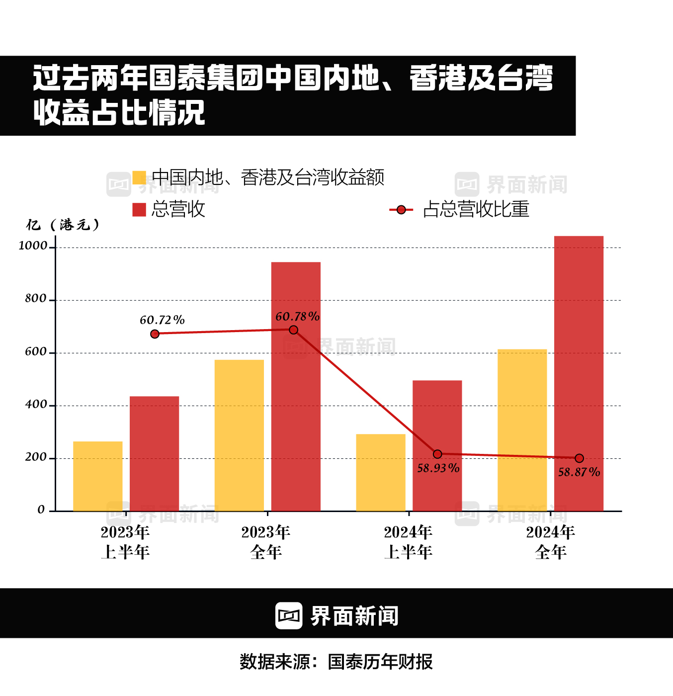 据界面新闻梳理,按地域来划分,从2023年上半年到2024年下半年,中国内地、香港及台湾占国泰集团总营收的比重分别达到60.72%、60.78%、58.93%和58.87%,基本占据半壁江山。内地市场的收益贡献可窥见一斑。