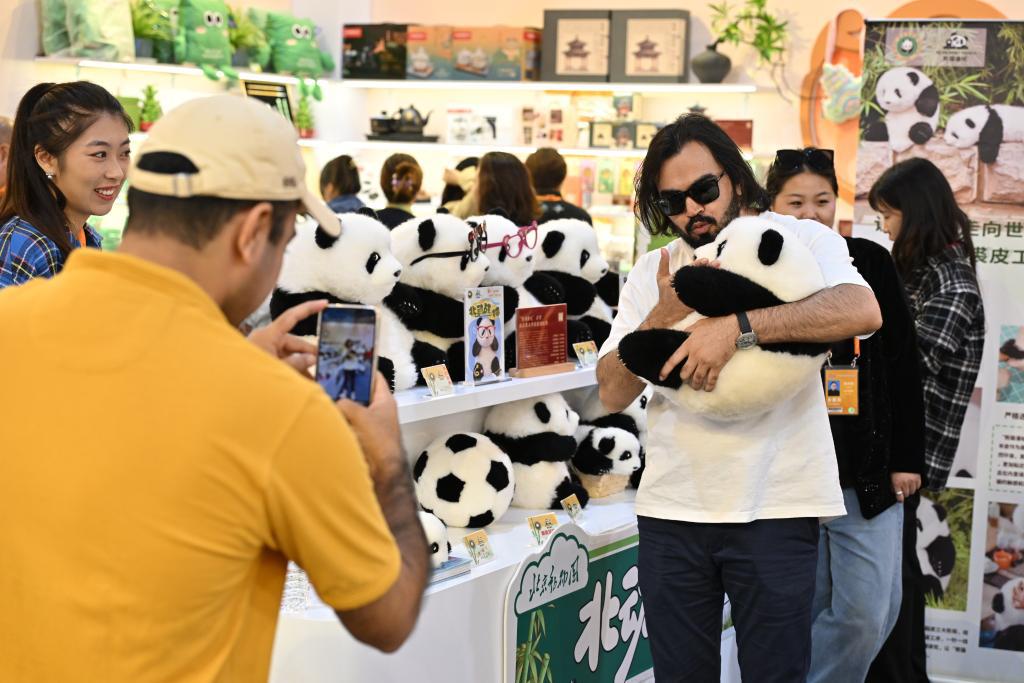 2024 年 9 月 16 日,参观者在 2024 年服贸会首钢园区文旅服务专题展区抱着北京动物园推出的大熊猫文创玩偶合影。新华社记者 李鑫 摄