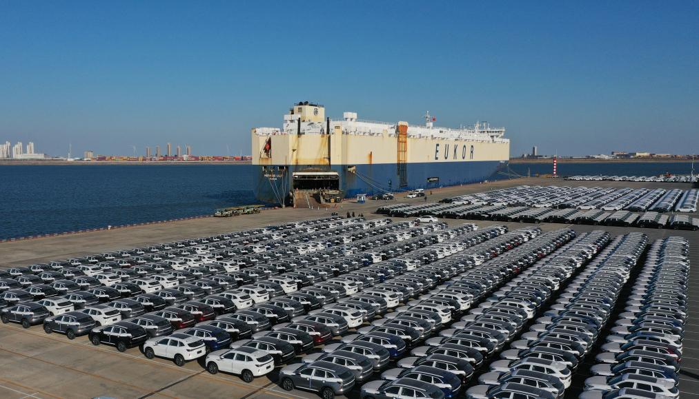 2025 年 2 月 25 日,来自京津冀地区的超 4000 辆国产自主品牌汽车在天津港环球滚装码头等待装船发往海外(无人机照片)。新华社记者 赵子硕 摄