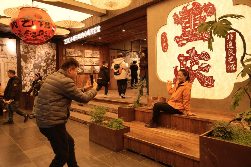市民在十八梯非遗民艺馆打卡拍照(央广网发 周长江 摄)