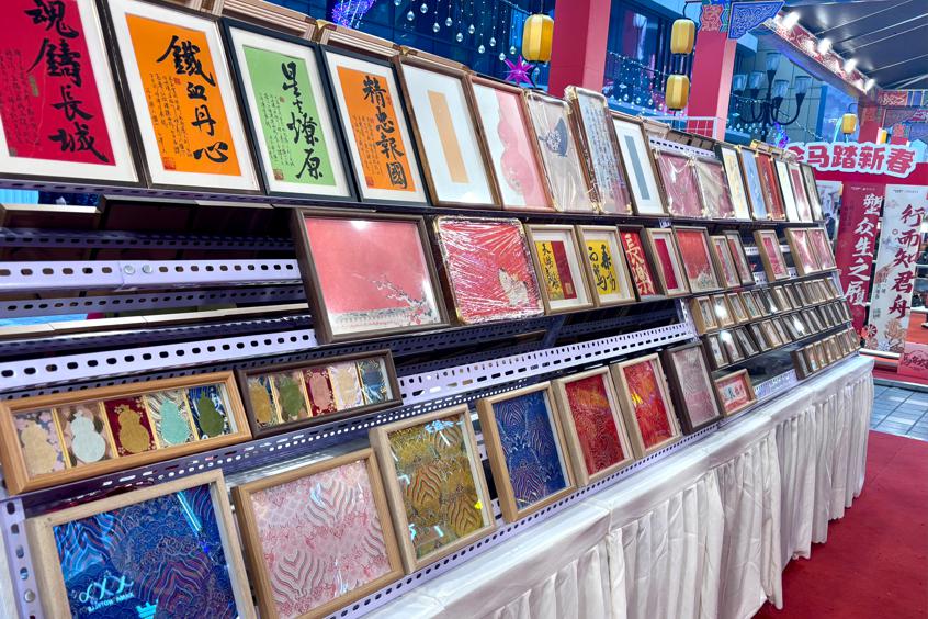 在解放碑重百新世纪年货市集上,漆画、扎染、书法画等各类非遗产品纷纷披上了 " 新年装 "。采用扎染技艺制作的小马布袋、融入宋锦文化的刺绣 " 福 " 字、书写着 " 吉祥如意 "" 马上成功 " 等吉语的书法画……巧妙融入了马年意象与新春吉祥元素,吸引众多市民和游客驻足。