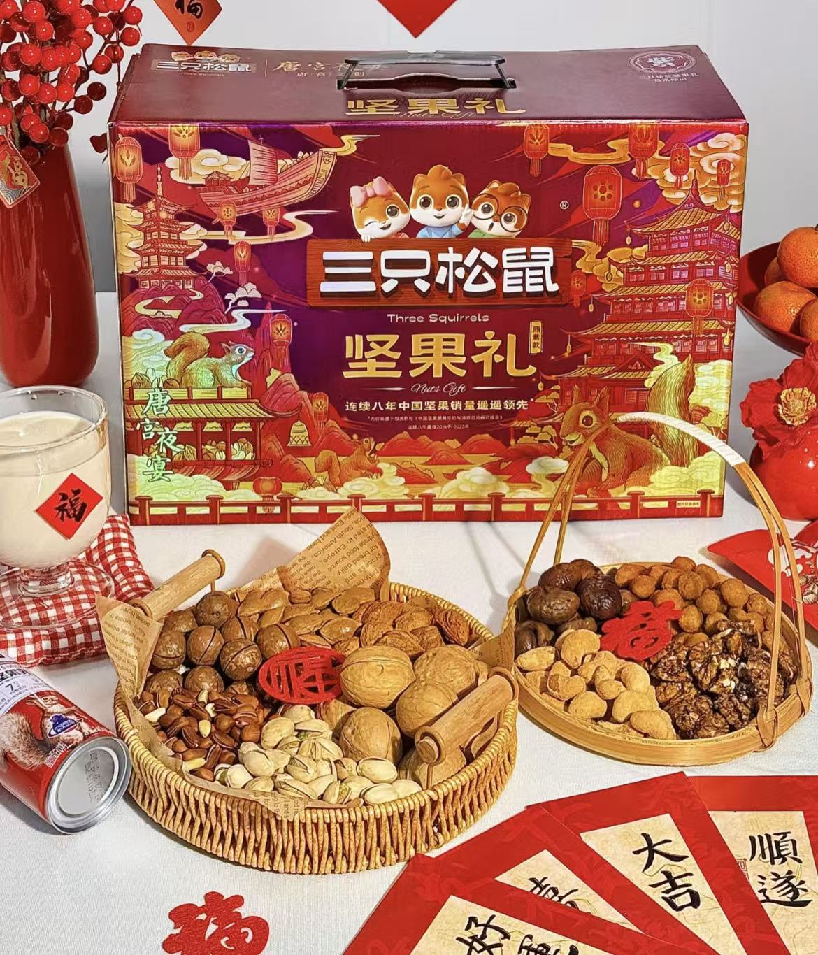 三只松鼠的策略同样指向这一点。一方面,三只松鼠今年的礼盒继续覆盖从大众到高端的多价格带。另一方面,通过“十二年轮”“金满葫”等创意型礼盒,把坚果从“标准化年货”转化为更有记忆点的春节物件。