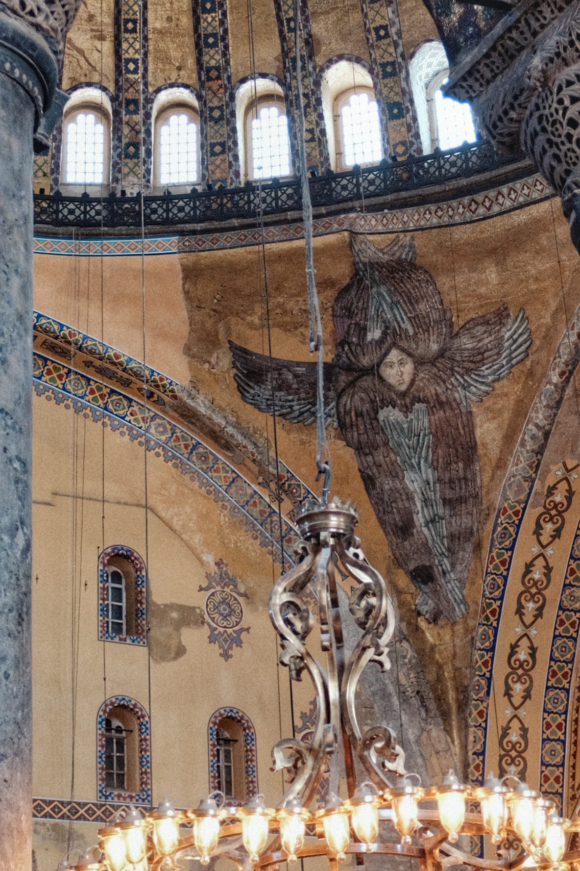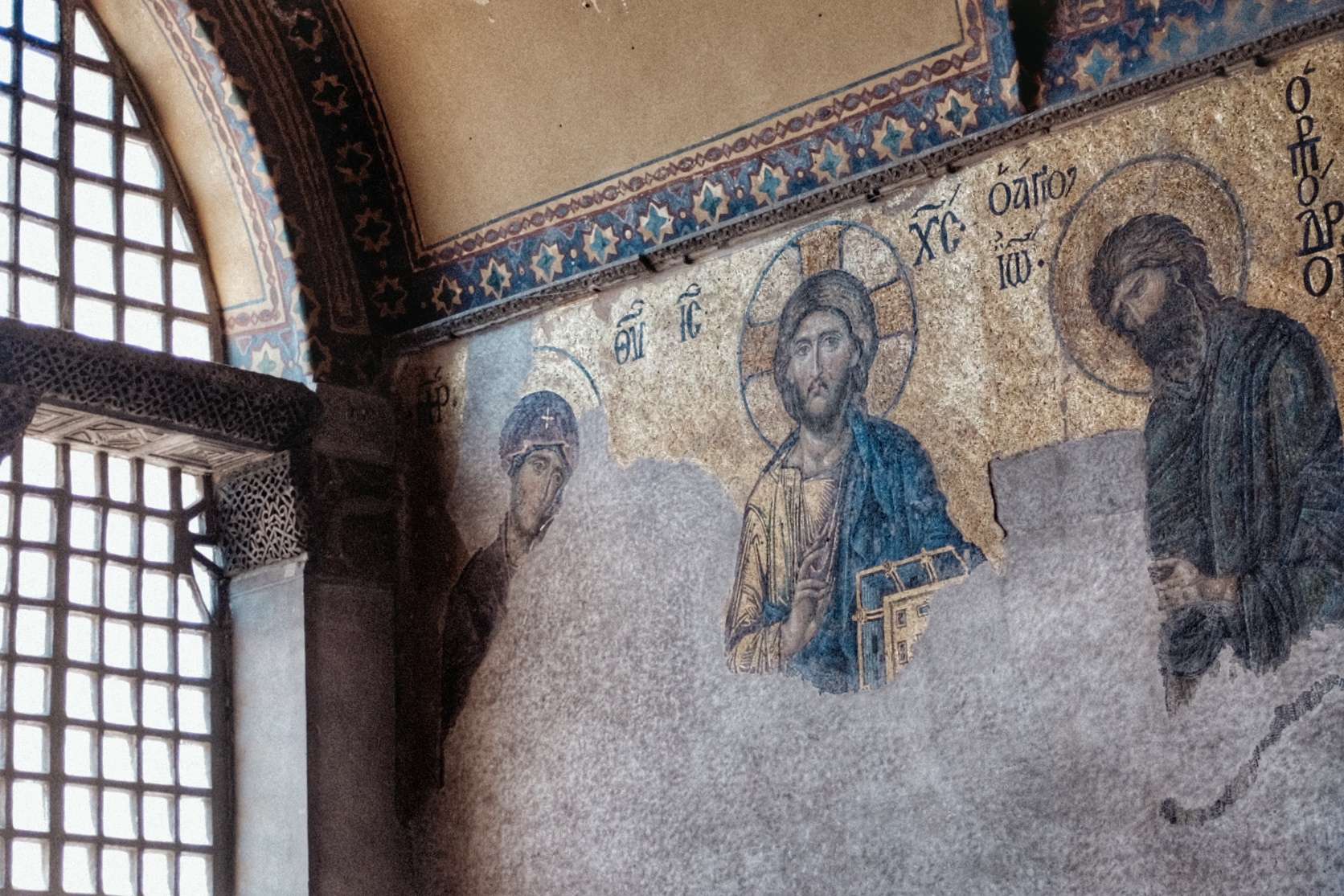 离开加拉塔港区域,我们终将坠入真正的伊斯坦布尔:当你走进圣索菲亚大教堂,时间的叠加变得几乎无法忽视。我看到的是一片混沌,是剥落与覆盖,是马赛克、壁画、基督、伊斯兰书法,是穹顶与结构,却又同时存在。这是一座被反复解释,却从未被简化的建筑。