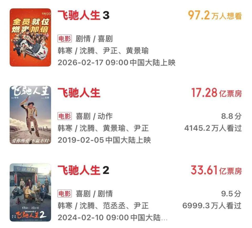 目前领跑春节档预售的影片《飞驰人生 3》为 IP 续作。影片由韩寒编剧并执导,沈腾领衔主演,尹正、黄景瑜、张本煜领衔主演,魏翔、沙溢主演,范丞丞、孙艺洲主演。此前《飞驰人生》为 2019 年春节档影片,最终收获 17.28 亿票房。《飞驰人生 2》则征战 2024 年春节档,累计票房超 35 亿元。沈腾的票房号召力叠加韩寒的编剧导演,《飞驰人生 3》是目前片单中最具大众号召力的电影,也吸引了包括万达电影、博纳影业、光线传媒等在内的多家上市公司投资或参与出品。