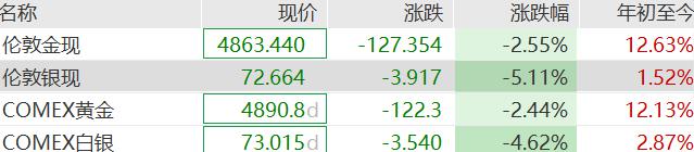 国际金银价短线下挫,现货黄金一度跌破 4850 美元,现货白银也曾失守 72 美元,为 2 月 6 日以来新低,日内跌超 5%,目前跌幅收窄。