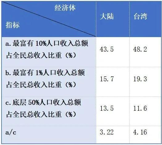 2024 年,台湾最富有 10% 和 1% 人口的收入总额占全民总收入的比重,分别比大陆高出 4.7 和 3.6 个百分点,而底层 50% 人口的收入总额占全民总收入的比重,又比大陆低 1.9 个百分点。若计算最富有 10% 人口的收入总额与底层 50% 人口的收入总额之比,台湾是 4.16,大陆是 3.22。