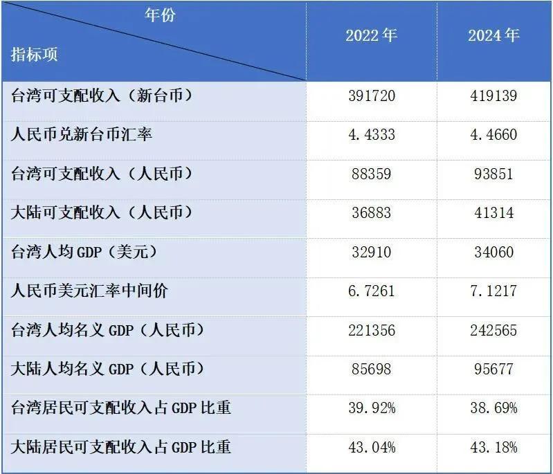 根据台湾行政部门发布的家庭收支调查报告,从 2022 年到 2024 年,台湾人均可支配收入从 391720 新台币增至 419139 新台币,分别折合人民币 88359 元和 93851 元,而大陆人均可支配收入从 36883 元上涨至 41314 元,占台湾比重达到 44%。