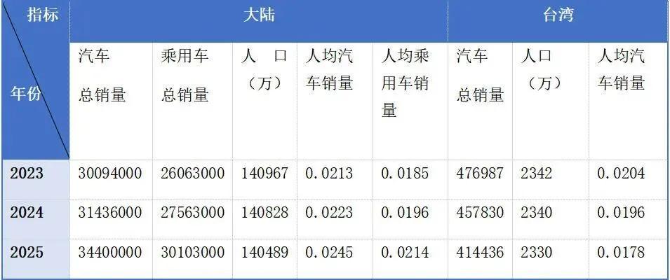 表 4 2023-2025 年大陆和台湾人均汽车销量对比