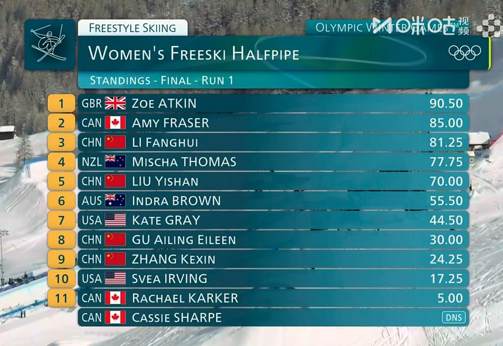 第一滑全部结束后,李方慧暂列第三,刘奕杉第五,谷爱凌第八,张可欣第九。