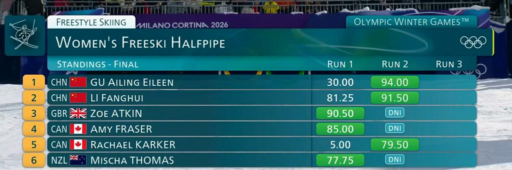 谷爱凌继续完美发挥,成绩提升到 94.75 分!