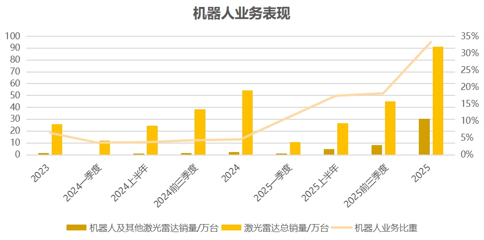 这一盈利差距主要源于两大业务的市场规模与定价逻辑。当前激光雷达在汽车领域已进入百万级规模化量产阶段,而机器人业务当前整体市场规模与单客户采购量级远小于汽车赛道,达不到车载级别的规模化降本与低价走量策略。与此同时,由于机器人业务覆盖工业AGV、商用配送、家用割草、人形机器人等数十个细分赛道,各场景在技术门槛、采购规模、定制化需求与市场竞争格局上存在显著差异,不同产品毛利率也呈现一定的区间波动。