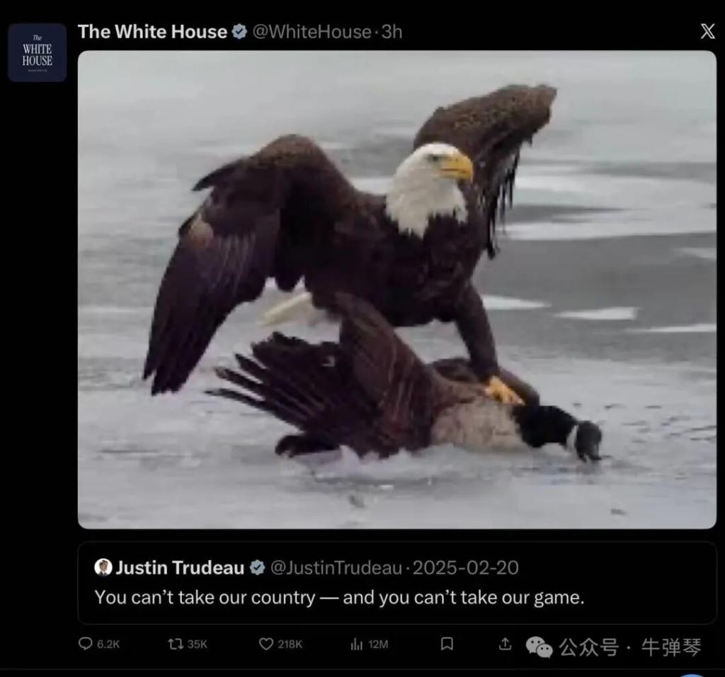 哪知道,白宫突然贴出一张图,图中,凶悍的白头鹰猛扑加拿大鹅,可怜的大鹅,被踩在脚底。