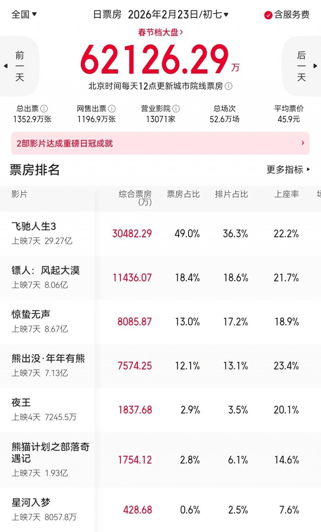 正月初一到初七(2 月 17 日 -2 月 23 日),中国电影市场总观影人次 1.19 亿,较去年同期(1 月 29 日 -2 月 4 日)下降 37.0%,7 天少卖电影票 7000 万张;总票房 56.98 亿元,较上年同期的 94.88 亿元,下降了四成左右。