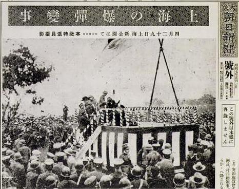 4 月 29 日 11 时 40 分,正当台上的日军军政要员呼喊狂欢之际,尹奉吉向检阅台掷出军用壶炸弹,正落在台中央,一声轰然巨响后,日军乱成一团,一共炸死炸伤十一人。