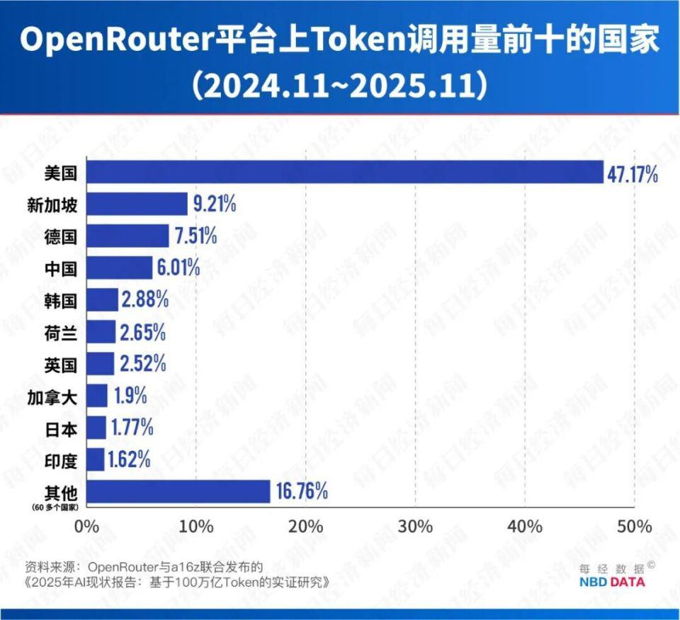 值得注意的是,该平台的用户主要由海外开发者构成,其中美国用户占比高达 47.17%,而中国开发者仅占 6.01%,这使得其榜单数据更能客观反映中国 AI 模型在全球范围内的真实吸引力。
