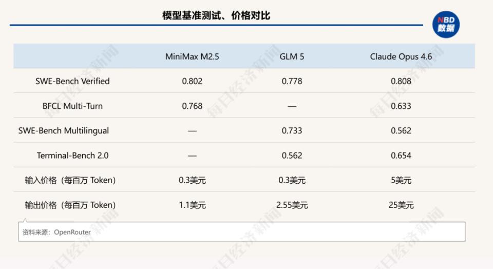 在模型处理输入信息(Input)的环节,MiniMax 的 M2.5 与智谱的 GLM-5,其价格均为 0.3 美元每百万 Token。作为对比,海外主流的对标产品 Claude Opus4.6 的价格则高达 5 美元 / 百万 Token,是中国这两款模型的约 16.7 倍。
