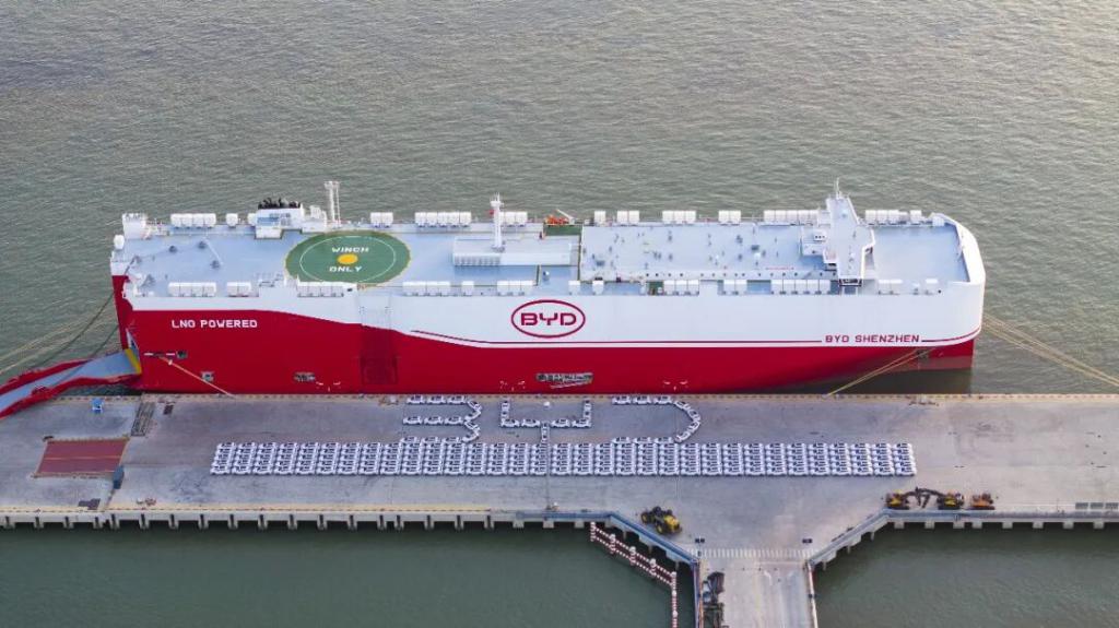 同年 4 月 27 日到 7 月 7 日,比亚迪专属的 " 深圳 " 号滚装船(9200 车位),历时 70 天完成首次跨洋远航——从江苏太仓出发抵达巴西,再返航至位于汕尾市的深圳小漠国际物流港;7 月 8 日,该船又装载 6818 辆比亚迪新能源汽车,驶往欧洲。